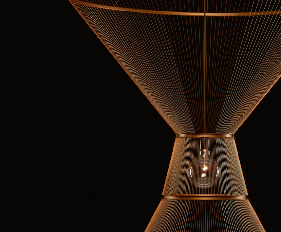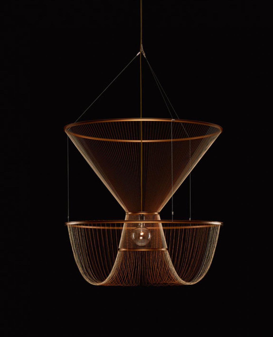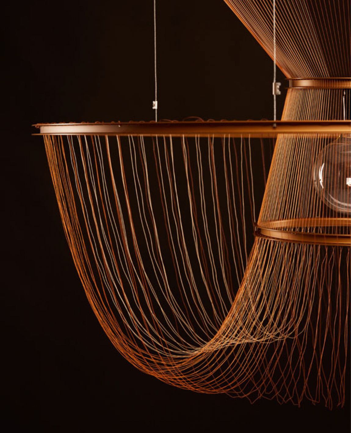 Influenced by the natural phenomena of Light, Studio Susanne de Graef designed a lighting piece that maintains the essence of light itself. The Rhythm of Light collection mimics the movement of the sun as it rises and sets each day. The fine threads display the spectrum of the rainbow. The shape and it’s structure is inspired by the crinoline ( a 19th century hoop skirt) . In the centre, diffused light from the singular bulb scatters, creating a lively interplay of light and shadow. The light can be installed in two different positions, allowing for a variety in form and appearance.